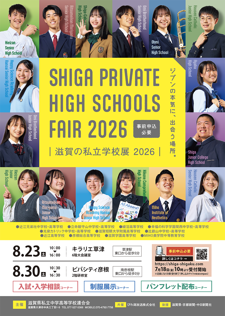 2025.08.04 「滋賀の私立学校展2026」2025年8月23日(土)・8月30日(土)開催!(申込期間7月18日(金)10時~) イベント名滋賀の私立学校展2026概要「滋賀の私立学校展2026」を開催します。滋賀県の私立学校(高等学校10校・中学校5校・中等教育学校1校)が一堂に会し、滋賀の私立学校の特色や魅力を紹介。(パンフレット配布・制服展示等)また、直接学校と個別相談が出来ます。ぜひ皆さまのご参加お待ちしています。(要申込)日時2025年8月23日(土)キラリエ草津2025年8月30日(土)ビバシティ彦根 一覧 次の記事 ›