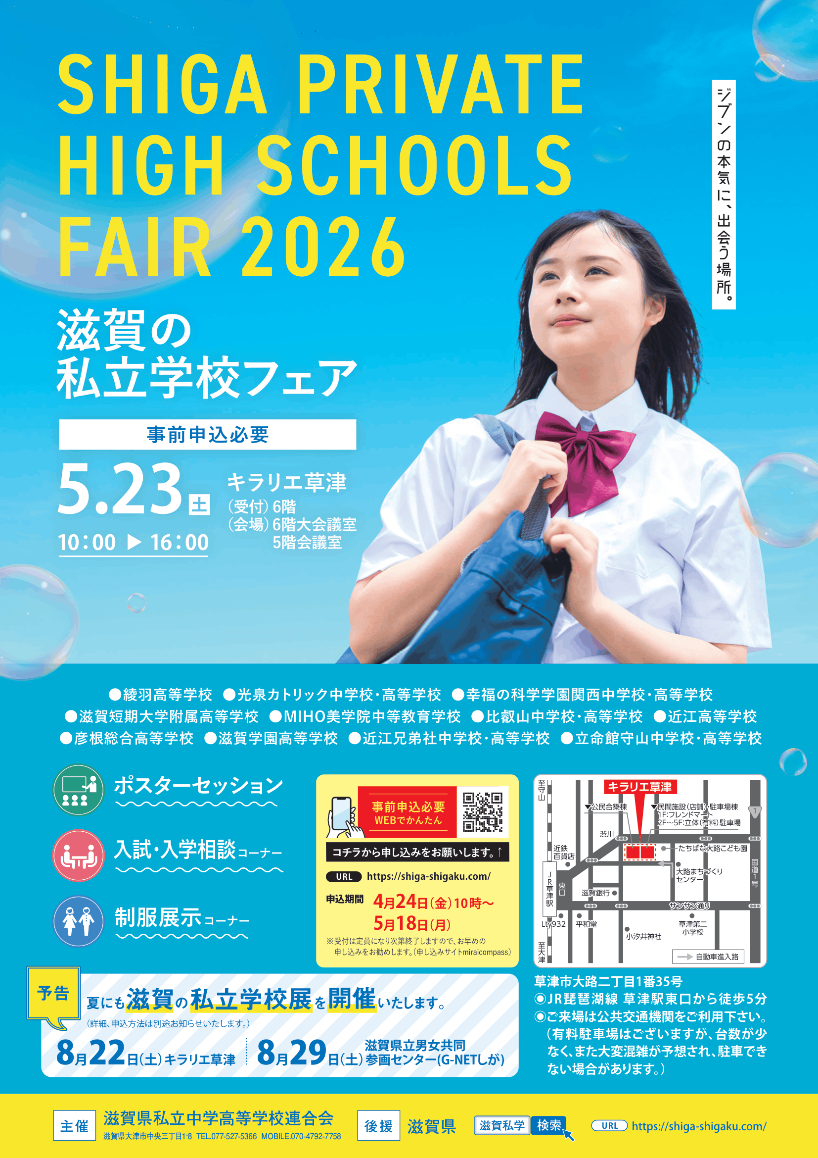 概要滋賀県の私立学校11校(高等学校10校・中学校5校・中等教育学校1校)が一堂に会し、滋賀の私立学校フェアを開催いたします。滋賀の私学の特色や魅力を紹介(各学校(中学校・高等学校)の現役の生徒によるポスターセッション・制服展示等)します。また、直接各学校の先生と個別相談が出来ます。ぜひ皆様のご参加お待ちしています。